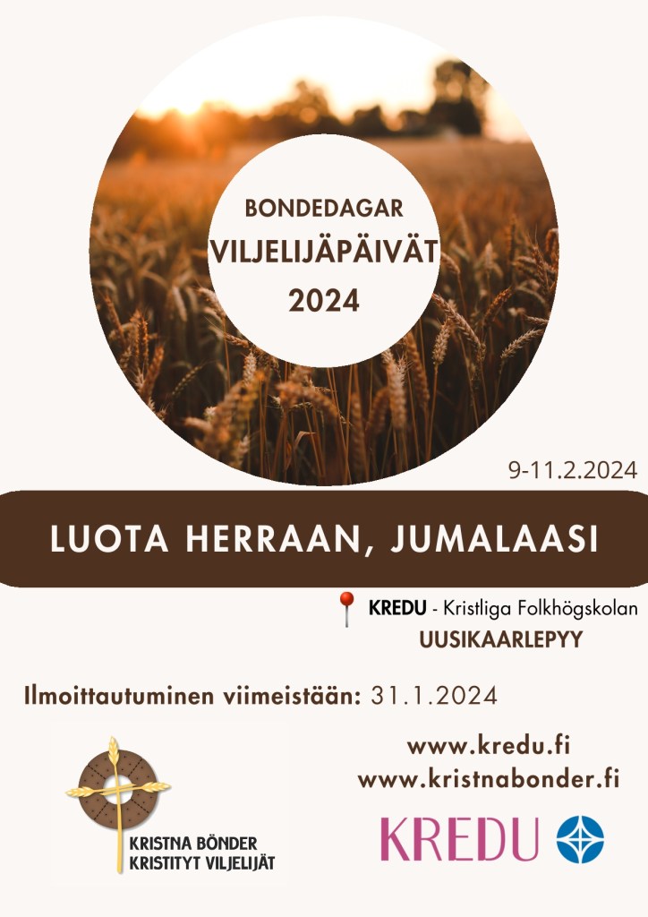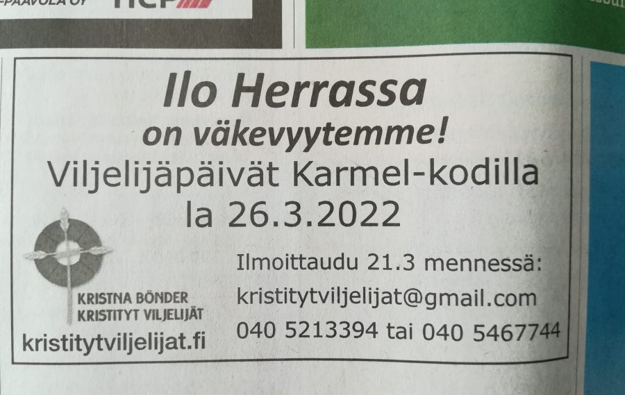 Kiitos Herralle jälleen hänen avustaan ja huolenpidostaan! Viljelijäpäivät sujuivat hyvin ja meitä oli koolla noin 90 eri puolilta Suomea. Keskusteluissa ja opetuksissa esille nousivat erityisesti kuuliaisuus ja luottamus Jumalaan. Viikonlopun opetuksissa nousi esille, että Herran tärkeimpänä tarkoituksena on viedä meidät perille hänen valtakuntaansa, ja elämämme tarkoituksena on tehdä valinta seurata häntä.