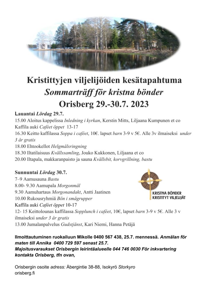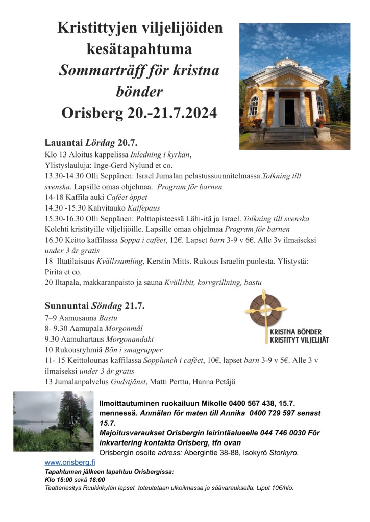Isonkyrön Orisbergiin kokoonnuttiin jälleen kesätapahtumaan 2022 heinäkuun lopulla. Ylihärmässä vierailtiin pellon laidalla ja Orisbergissä kuultiin mm. Martti Vähäkankaan puheenvuoro sekä terveisiä Israelista.