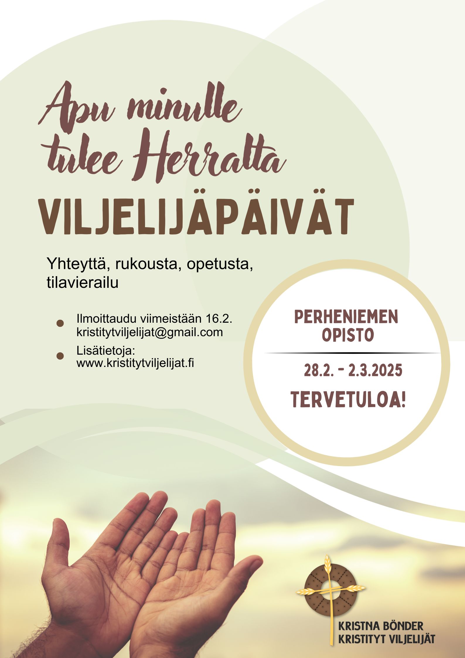 Viikonloppuna saimme olla rohkaisemassa toisiamme viljelijän työssä, kuulla todistuksia ja Raamatunopetusta sekä keskustella ja rukoilla yhdessä. Osallistujia oli mukana ennätysmäärä ja suuri ilonaihe oli myös lasten ja nuorten runsas osallistuminen. Olemme kiitollisia Herralle tapahtumasta ja kaikesta hänen johdatuksestaan!