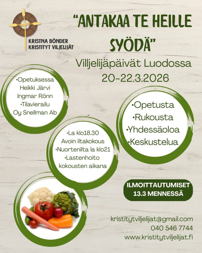 Voit ilmoittautua mukaan viljelijäpäiville viimeistään 13.3. lähettämällä sähköpostia osoitteeseen kristitytviljelijat@gmail.com tai soittamalla Kaj: 040 546 7744.
